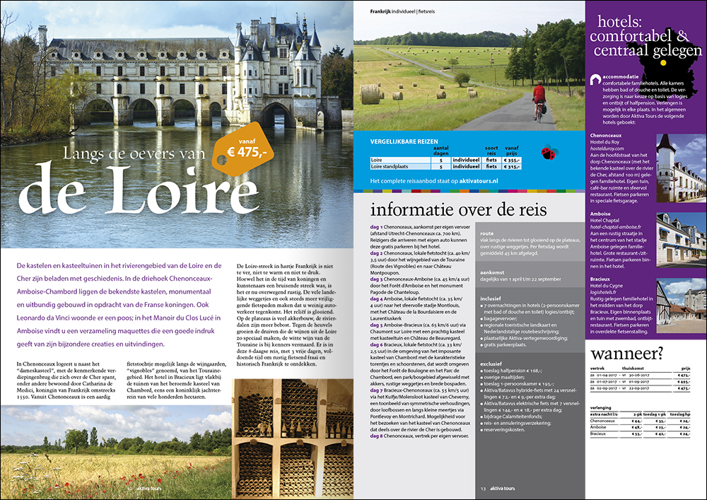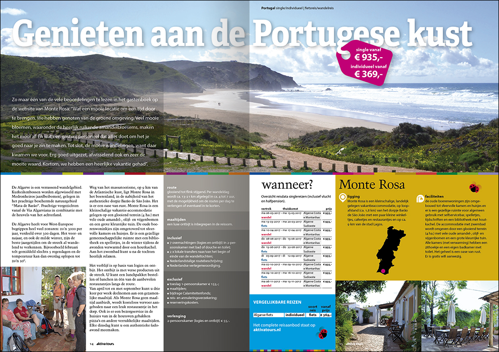 De vakantiereizen van Aktiva Tours boek je via hun website. Maar hoe krijg je bezoekers en boekers op die website? Door middel van een teaser-magazine met daarin een compacte presentatie van reizen en mogelijkheden. Een overzicht van de reizen, achtergrondinformatie, prijzen en data. In een grote oplage verspreid is dit de startmotor van het boekingseizoen! Doet zijn werk tijdens vakantiebeurs en events. En zie. Het boekt!