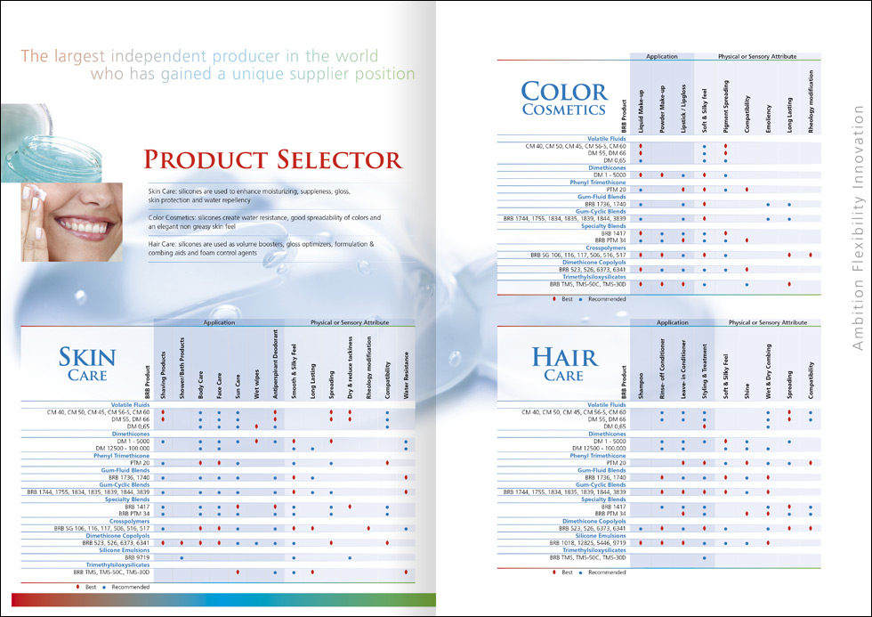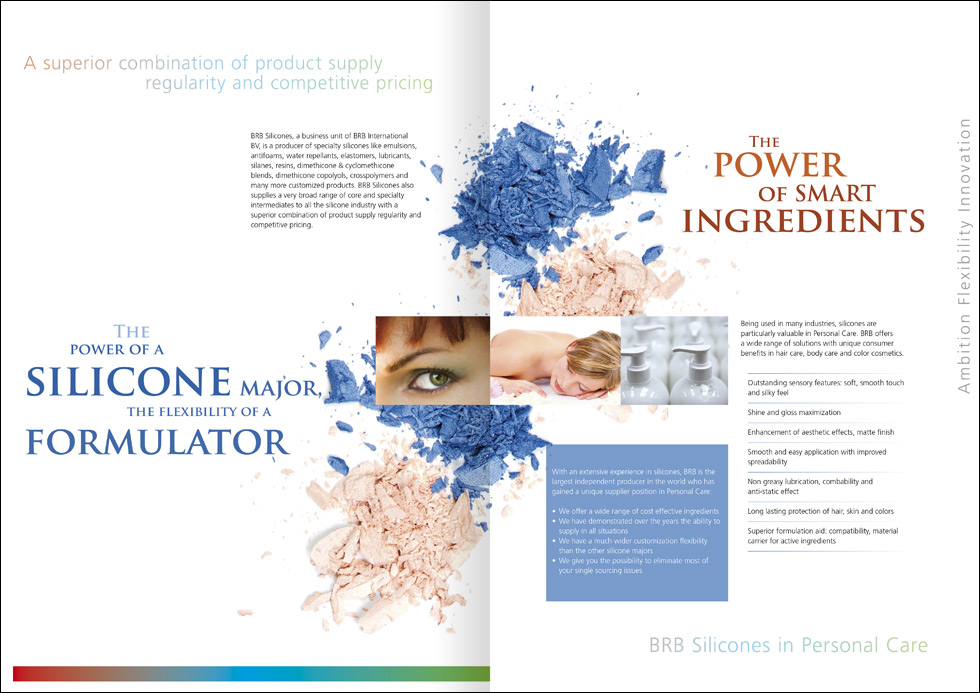 BRB Silicons ontwikkelt halffabrikaten voor body & beauty producten. De presentatie en vormgeving is in stijl van de eindproducten. Heel slim, zo spreek je dezelfde taal als de doelgroep. De brochure bevat veel tabellen met technische specificaties en is geïllustreerd met beeldmateriaal van poeders en gels.