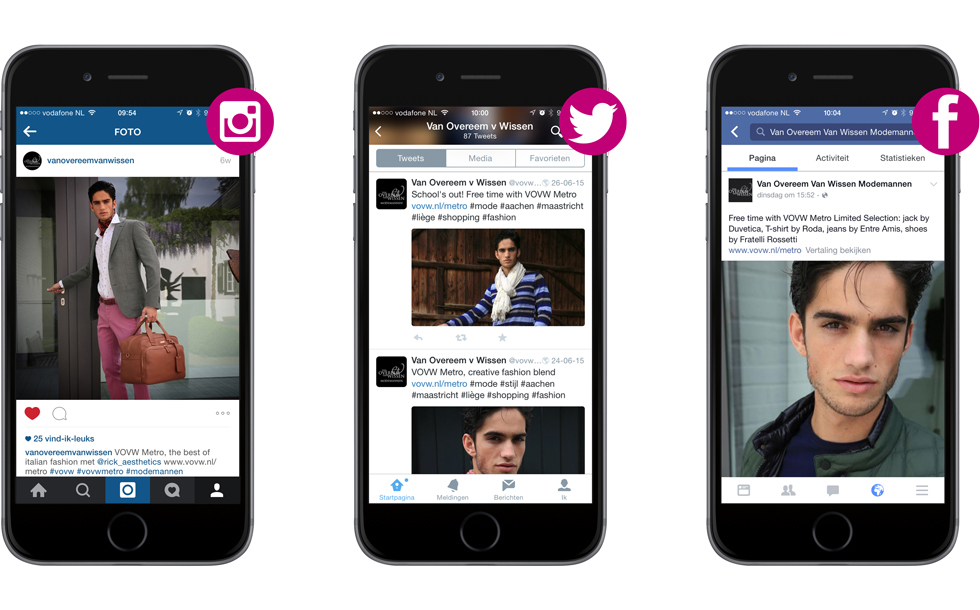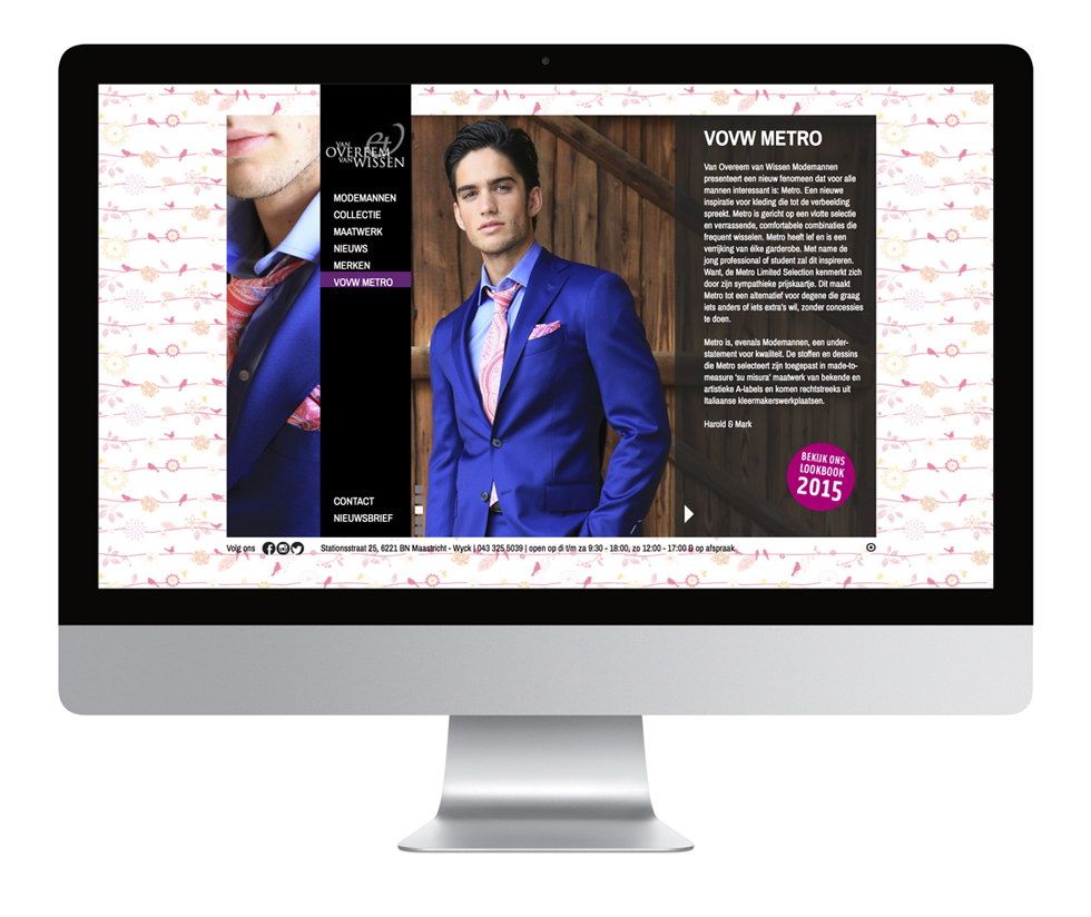 De kledinglijn heette VOVWMETRO. Blended Fashion Ideas in a Limited Selection. Een slimme mix van actuele mode. Lancering van dit nieuwe label van Van Overeem Van Wissen Modemannen realiseerden we met fotoshoots, styling, productie van reclame-stands, een digitaal Lookbook, Facebook, Twitter en Instagram campagnes, een e-mailing en website promotie.
