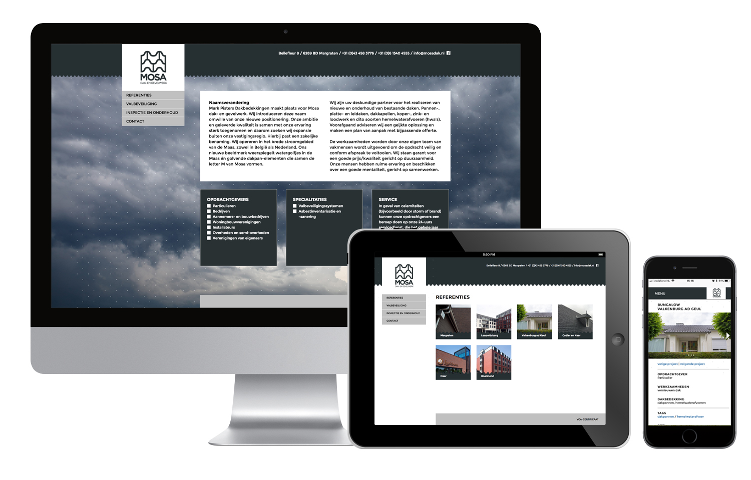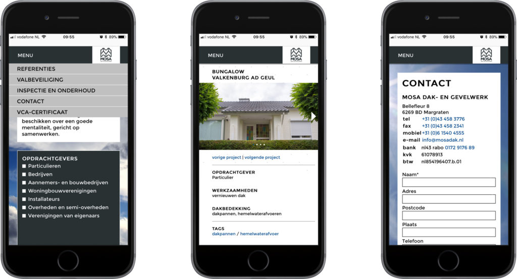 De website voor Mosa dak- en gevelwerk laat visuals zien waarvoor daken bedoeld zijn, maar geen daken als zodanig! Daken moeten bescherming bieden tegen regen, wind, sneeuw, hagel, zon en andere invloeden van buitenaf. Grafische verbeeldingen van ‘het weer’ die de bezoeker meteen op het netvlies heeft. ‘Anders denken’ om onderscheidend te zijn, maar vooral om de boodschap goed uit te dragen én de doelgroep scherp voor ogen te houden.